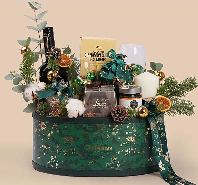 cesta navideña con vino, aceite, frutos secos, chócale ,mas productos y decor con entrega