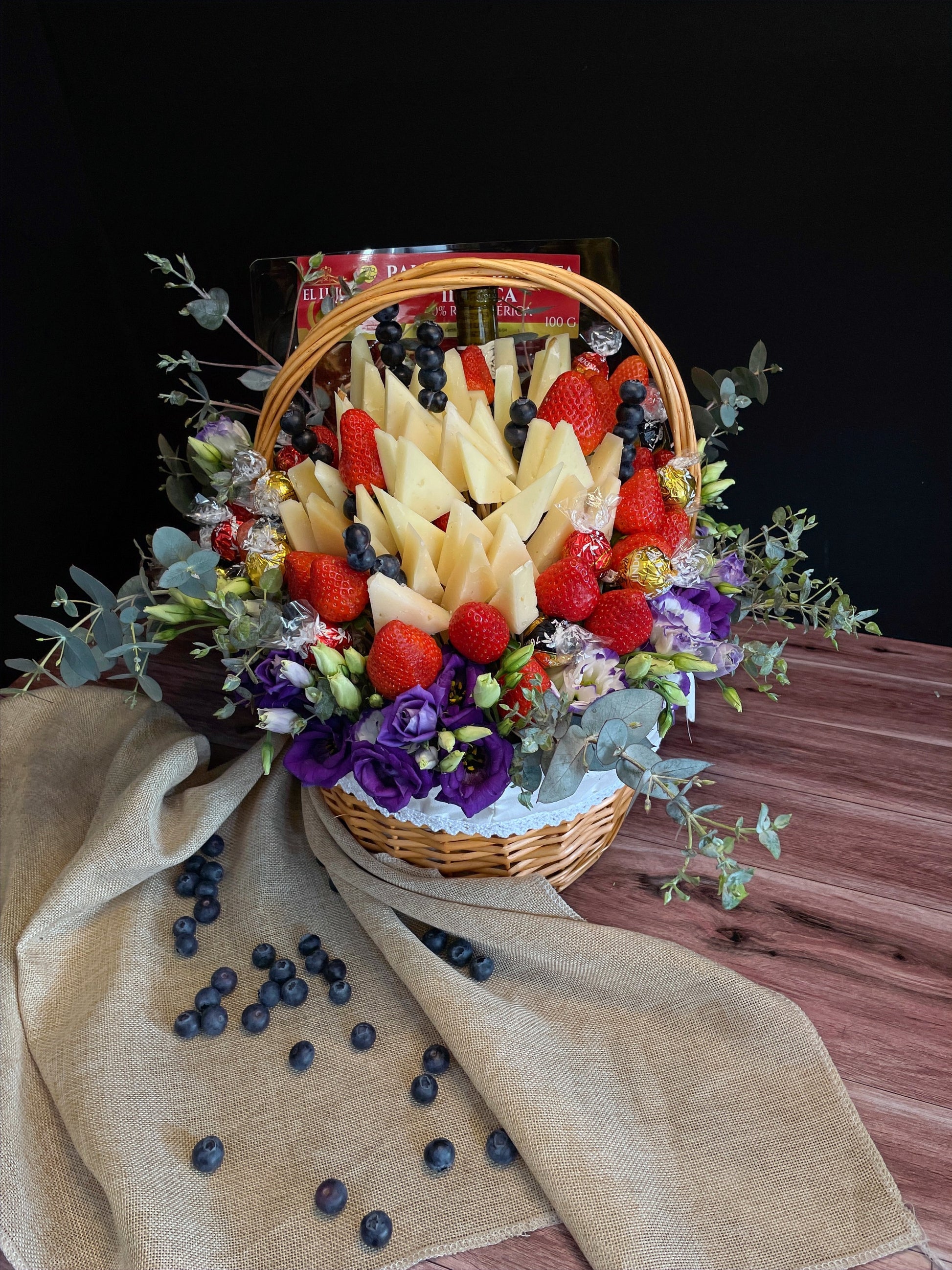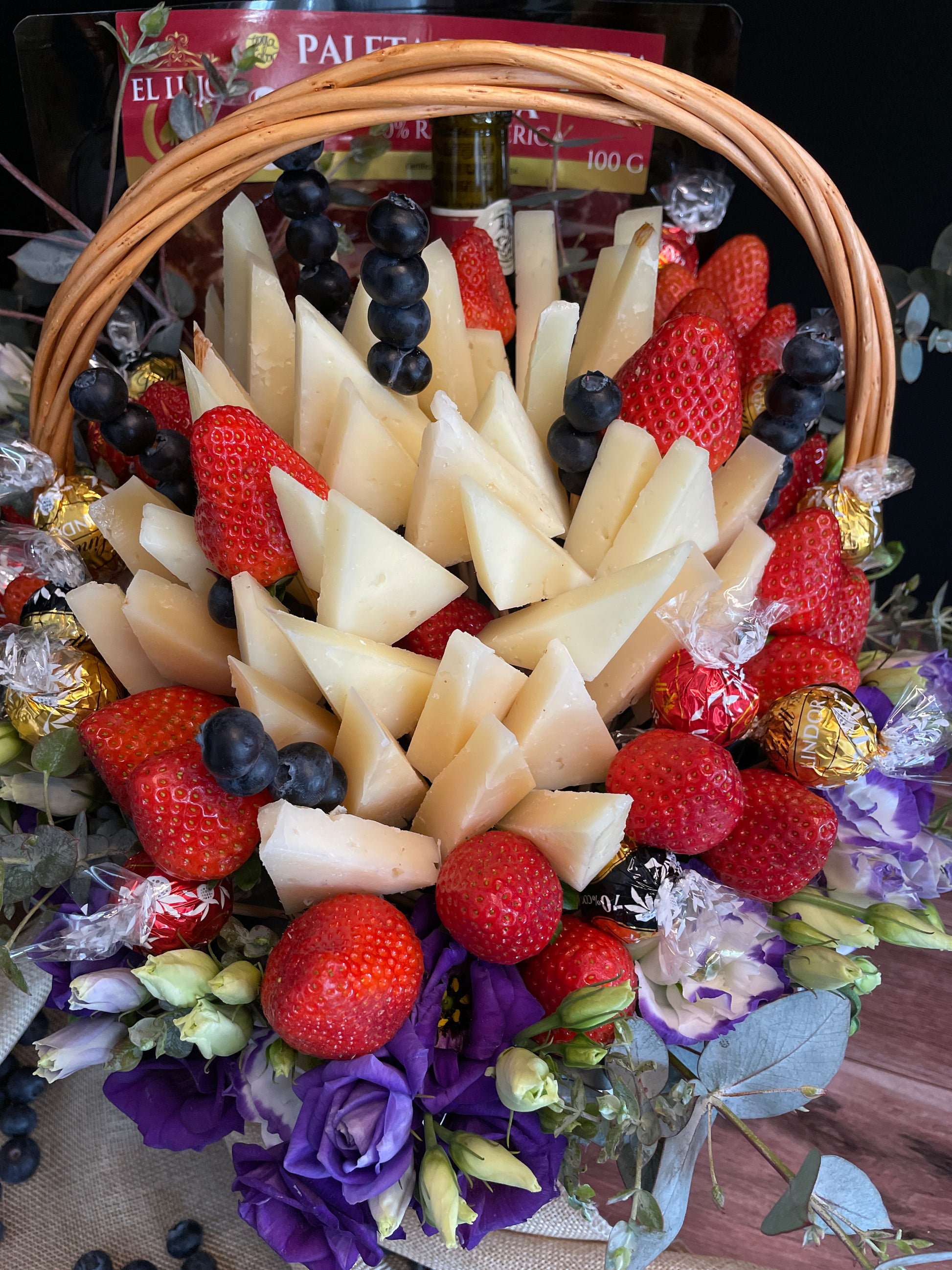 Paleta ibérica de bellota ,vino tinto, fresa, arándanos, queso curado , flores naturales,bombones de chocolate,cesta