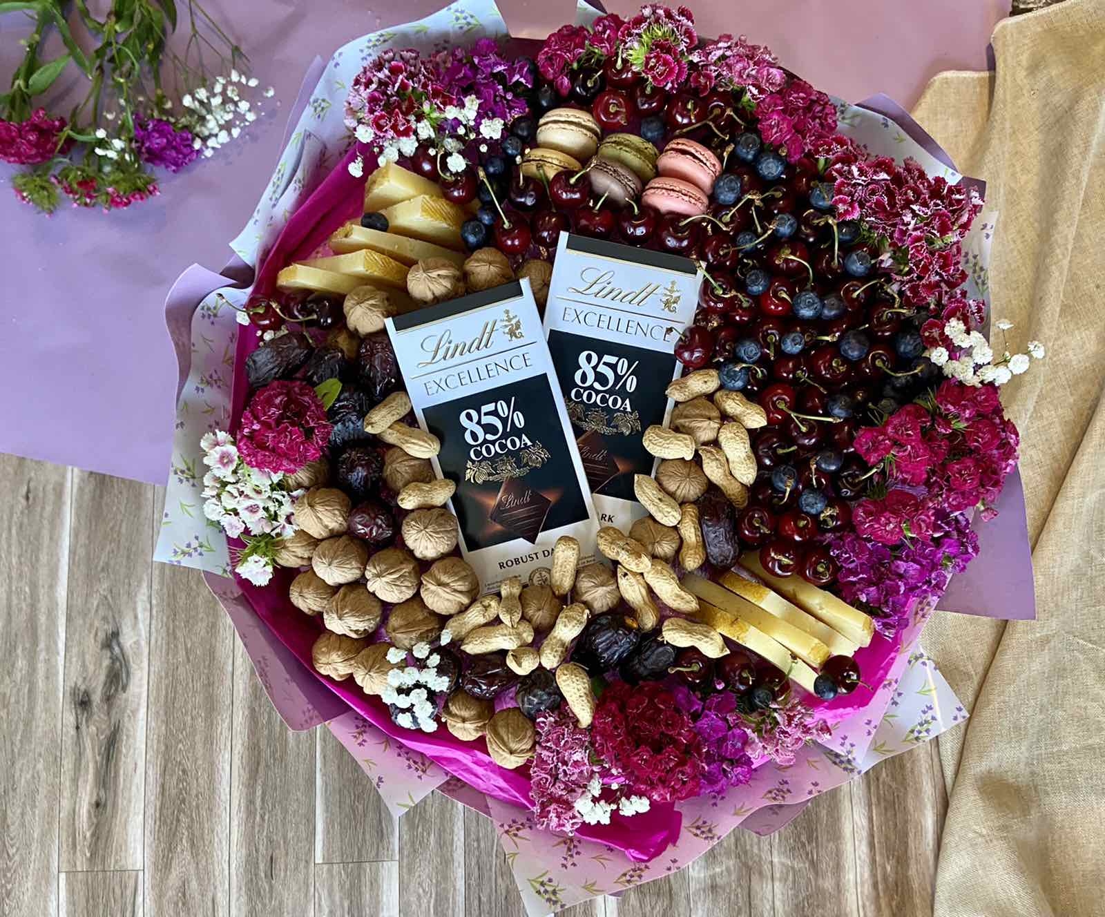 con frutos rojos, chocolate negro, queso, frutos secos