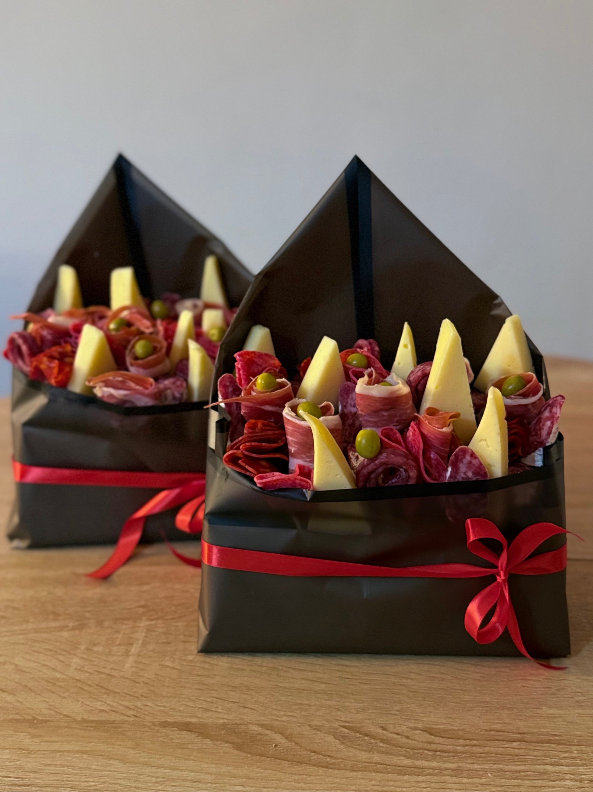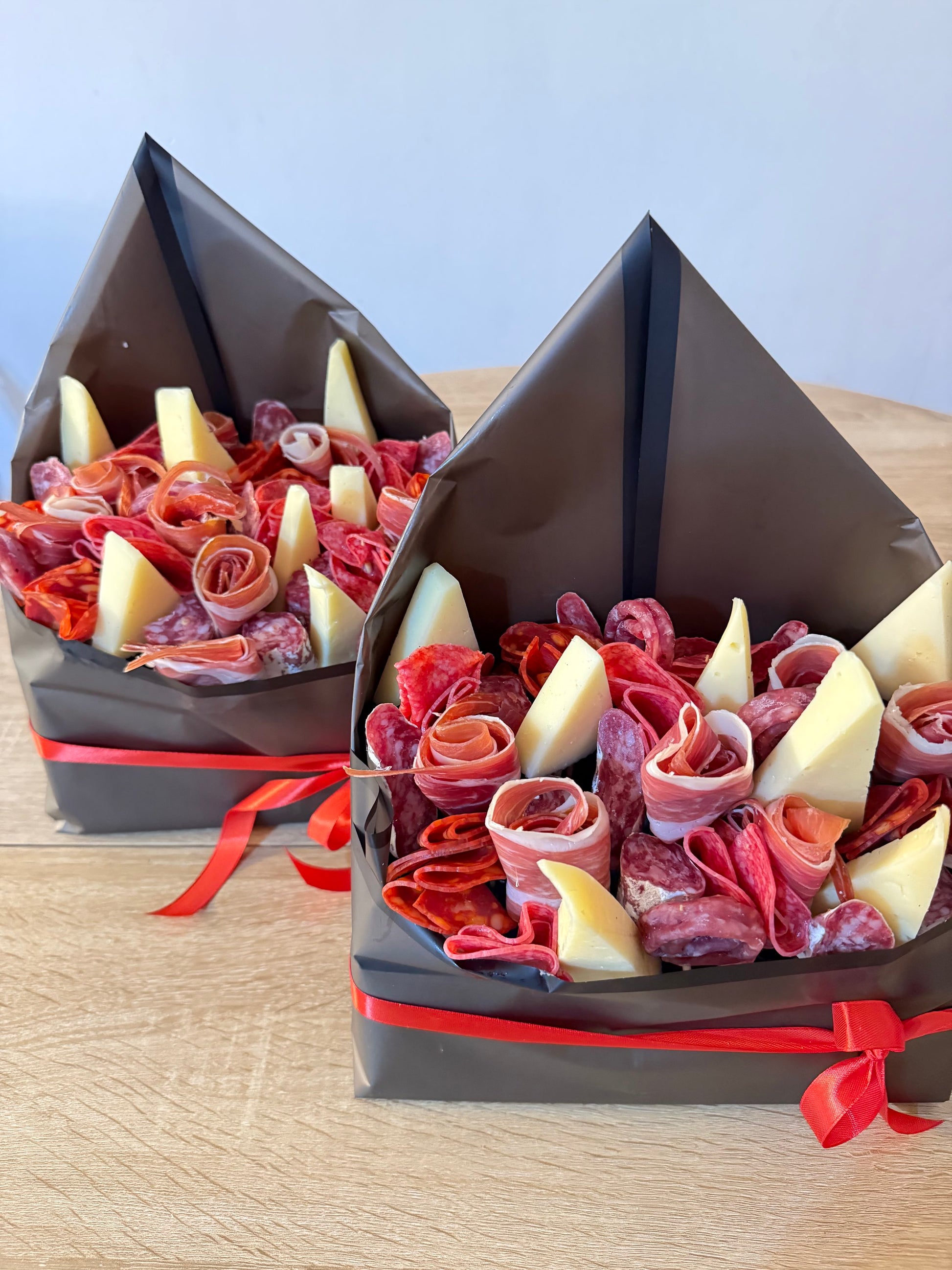 En lugar de los ramos habituales, una composición exquisita con los mejores embutidos, quesos curados y aceitunas. Ideal como regalo, para una velada especial o simplemente para disfrutar con los seres queridos.