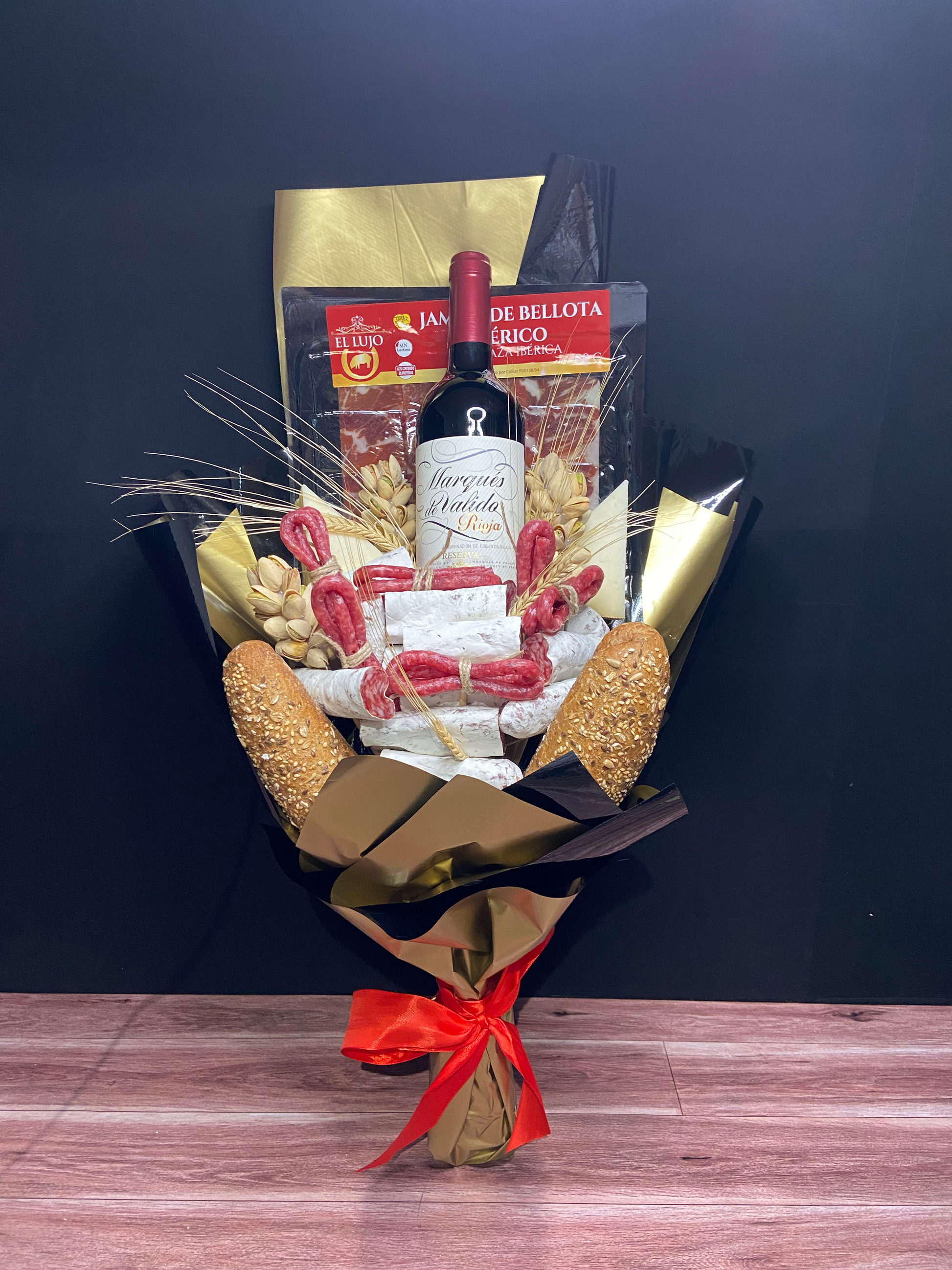 2 Jamón de Bellota Ibérico 100% Raza Ibérica, Fuet, flores de pistachos, Vino tinto gran reserva Marqués de Valido D.O.Ca Rioja 75 cl.,pan, queso curado